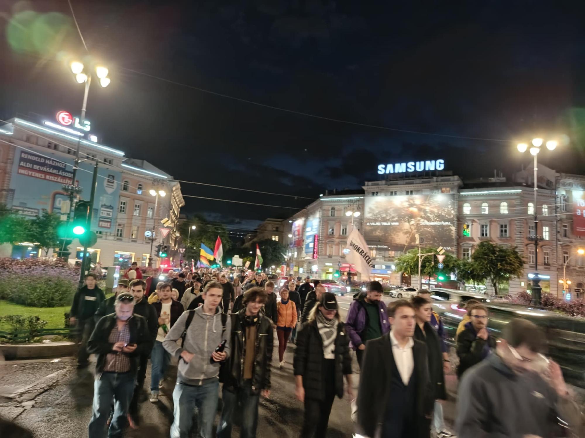 A vonulás az eddigiekhez hasonlóan alakult, útközben már újra zúgott a "mocskos Fidesz" és szokás szerint a tömeg meg-megállt énekelni egy-egy zebránál.
