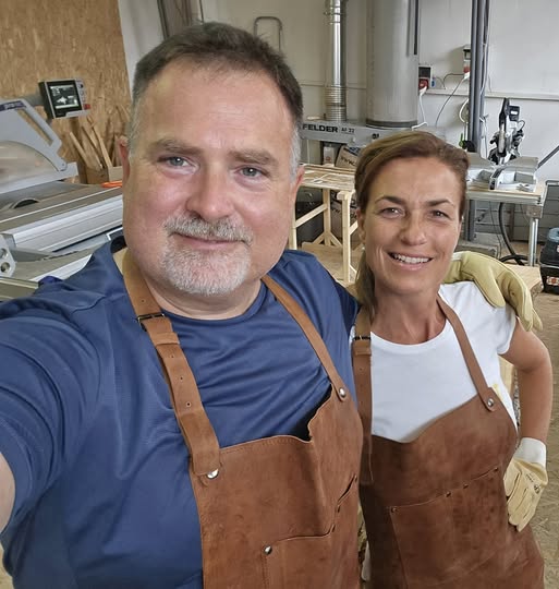 Windisch László és párja egy asztalosműhelyből posztolt bőrkötényben.