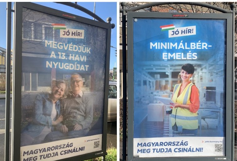 Ilyenek voltak például a 13. havi nyugdíj „megvédése” érdekében az írott és az elektronikus sajtóban, óriásplakátokon terjesztett hirdetések, amelyekben a kormányzat az Európai Unió Parlamentjét, a magyar ellenzéket és Magyar Pétert azzal vádolta, hogy el akarják venni a 13. havi nyugdíjat és a nyugdíjkorrekciót.