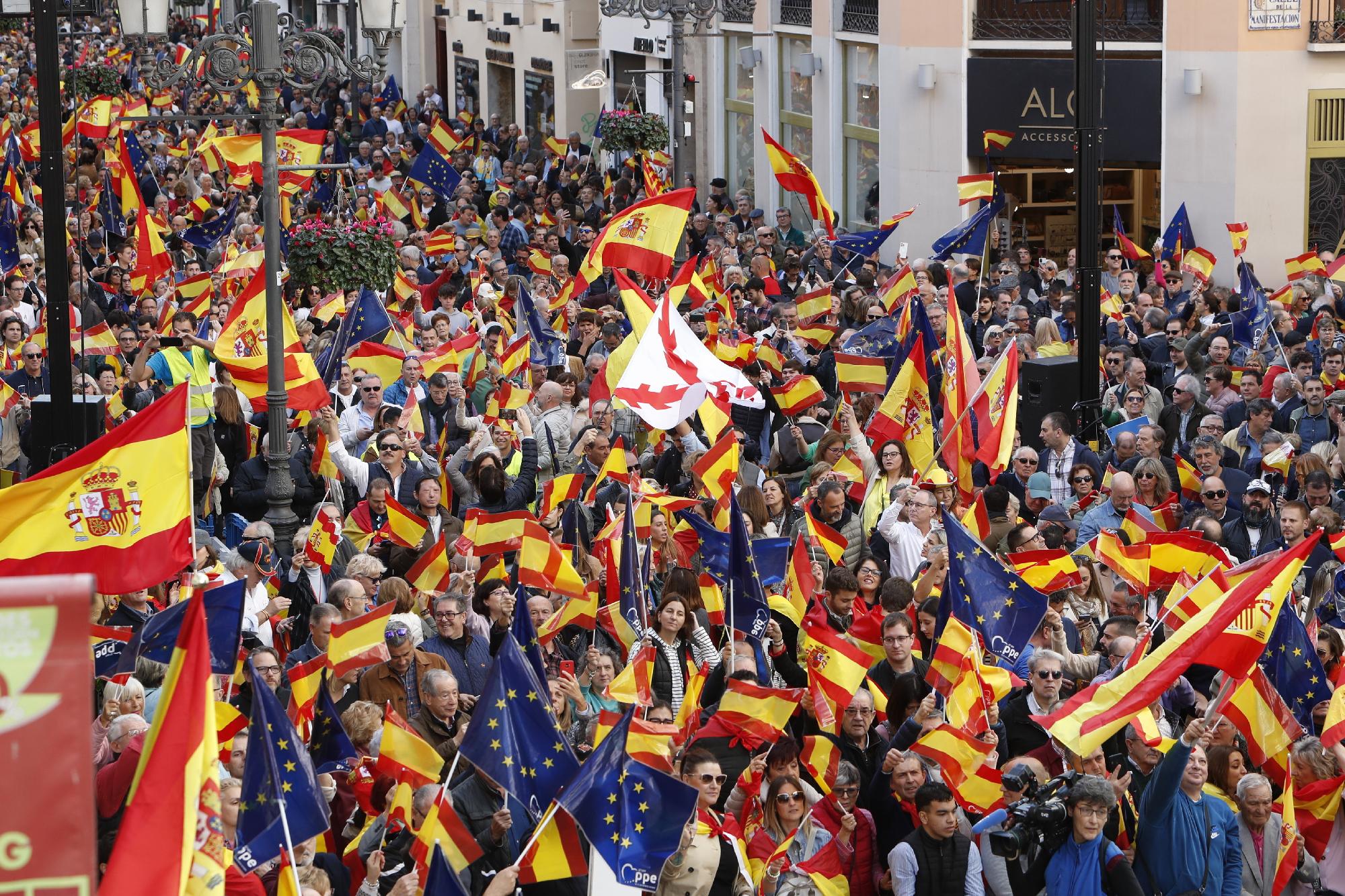 Spanyol zászlókat lengetnek tüntetők a 2017-ben alkotmányellenesnek nyilvánított katalán függetlenségi népszavazás megrendezése miatt elítélt politikusok amnesztiájáról szóló megállapodás elleni tiltakozáson Madridban 2023. november 12-én. Az ellenzéki konzervatív Néppárt (PP) felhívására több spanyol nagyvárosban vonultak utcára az emberek, hogy tiltakozzanak a kormányzó Spanyol Szocialista Munkáspárt (PSOE) törvénytervezete ellen.