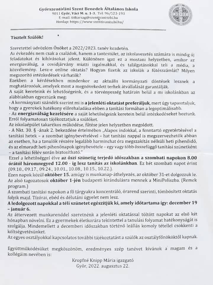 Az őszi szünetig hét szombati napon is oktatnak a győrszentiváni Szent Benedek Általános Iskolában, hogy hosszabb lehessen a téli szünet, így spórolnak a fűtésen.
