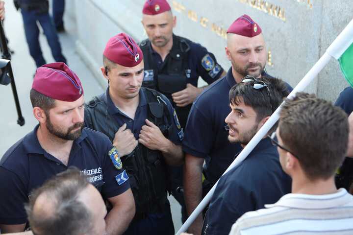Végül a momentumos Bedő Dávidot átengedték a sorfalon, aki tárgyal a rendőrökkel. Aztán a tüntetők is megpróbálják meggyőzni a rendőröket, hogy engedjék át őket, de nincs hatása. Erre néhány tüntető azt kiabálja nekik, hogy "Bohócok!".