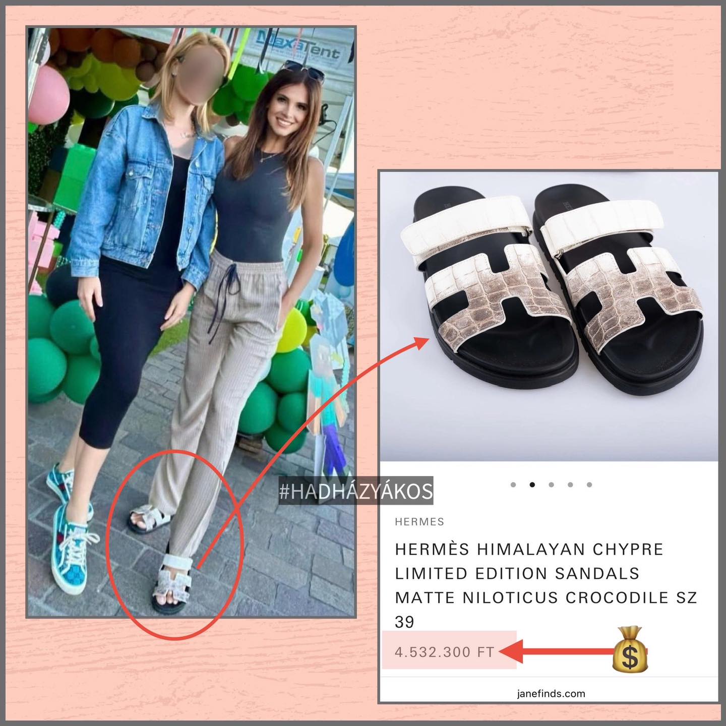 A képen a Rogán Cecília barátnője és üzlettársa által viselt lábbeliről megjegyzi, az új modellek ára: Hermes Chypre Techno szandál Himalaya krokodilbőrből: kb. 7,500 - 8,000 dollártól indul és határ a csillagos ég - Ez egy ritka, limitált kiadású modell, amelyet például a Madison Avenue Couture kínálatában és más luxus shoppokban találhatunk meg.