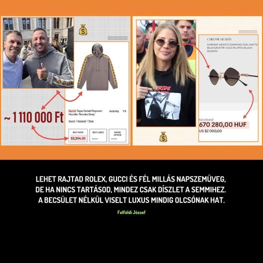 „Tessék mondani, hol a gerincetek? Én nagyon-nagyon szégyellném magam!” – üzent Felföldi József debreceni milliárdos, a Quick Milk nevű, szívószálakat gyártó vállalat tulajdonosa a Békemeneten részt vevő fideszes celebeknek, más kiválóságok mellet Szabó Zsófinak, aki Hadházy Ákos megfigyelése szerint 670 ezres napszemüvegben, valamint Curtis-nek, aki meg 1, 1 milliós Gucci-pulcsiban „luxizott” a Békemeneten.