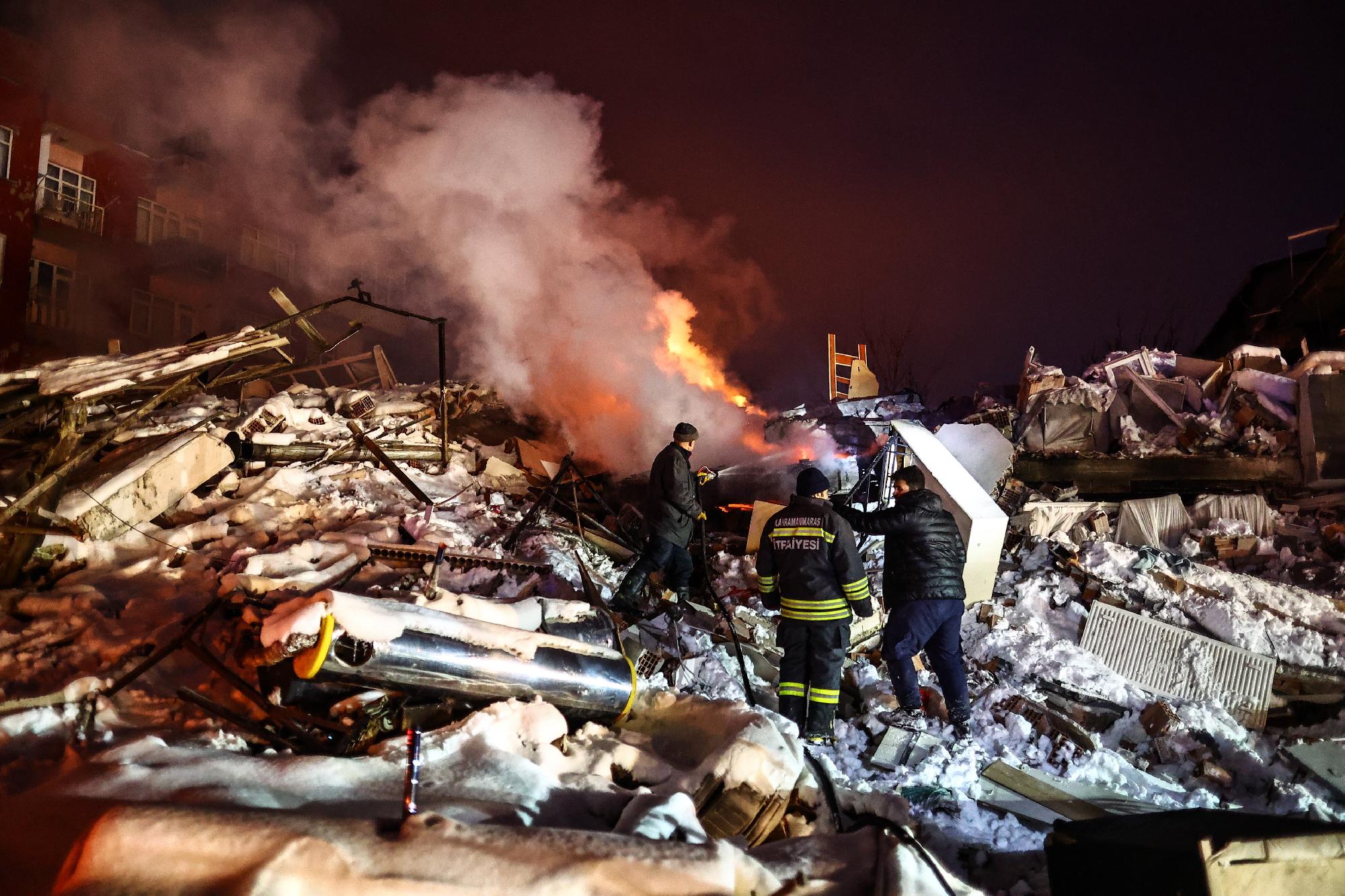 Túlélők után kutatnak mentőalakulatok tagjai összedőlt épületek romjai között a délkelet-törökországi Kahramanmarasban 2023. február 7-én. Fotó: MTI/EPA/Sedat Suna