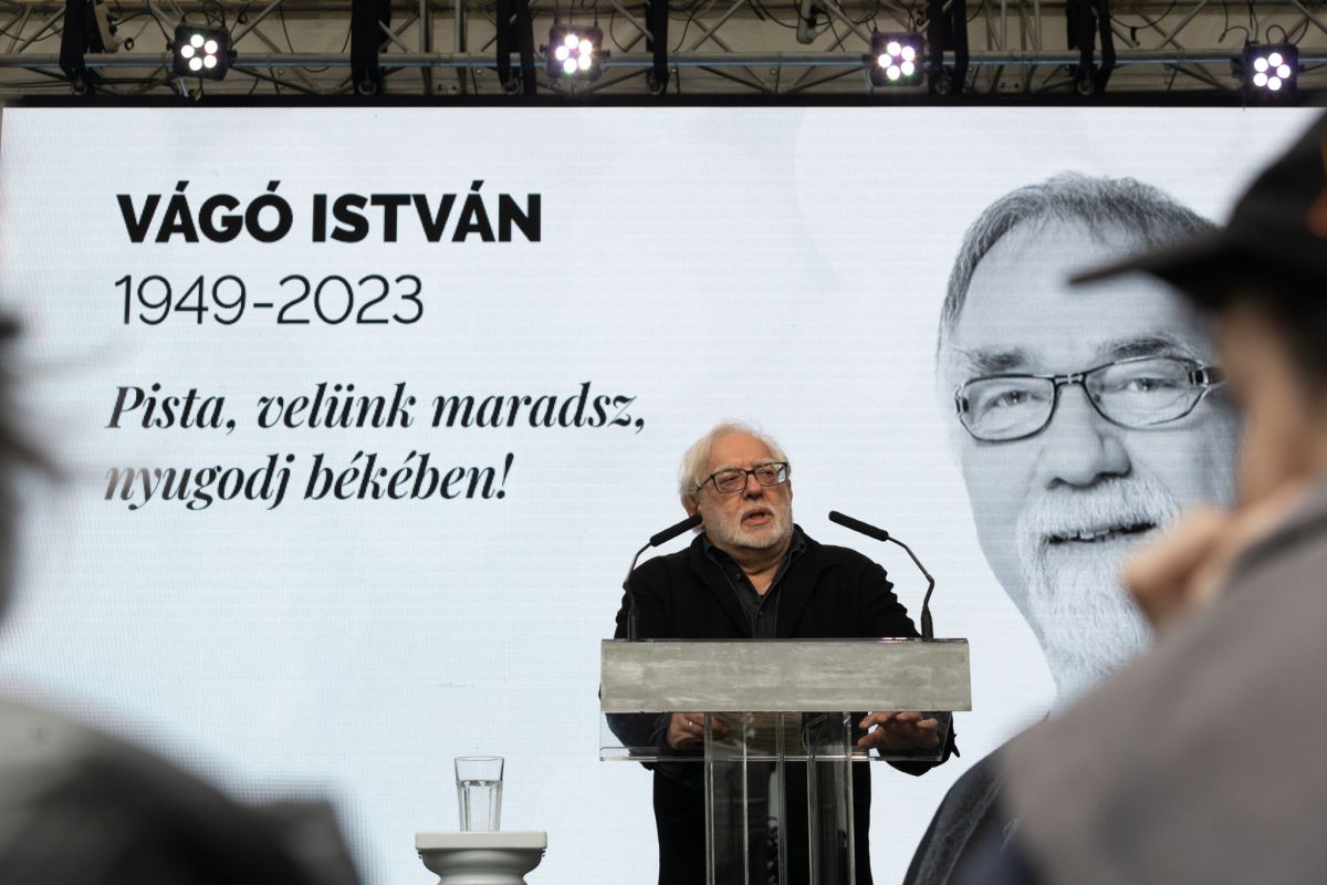 A búcsúztatót Gréczy Zsolt, a DK országgyűlési képviselője zárta, a búcsúbeszédek végén Vágó István fotója alatt többen is fehér virágokat helyeztek el.