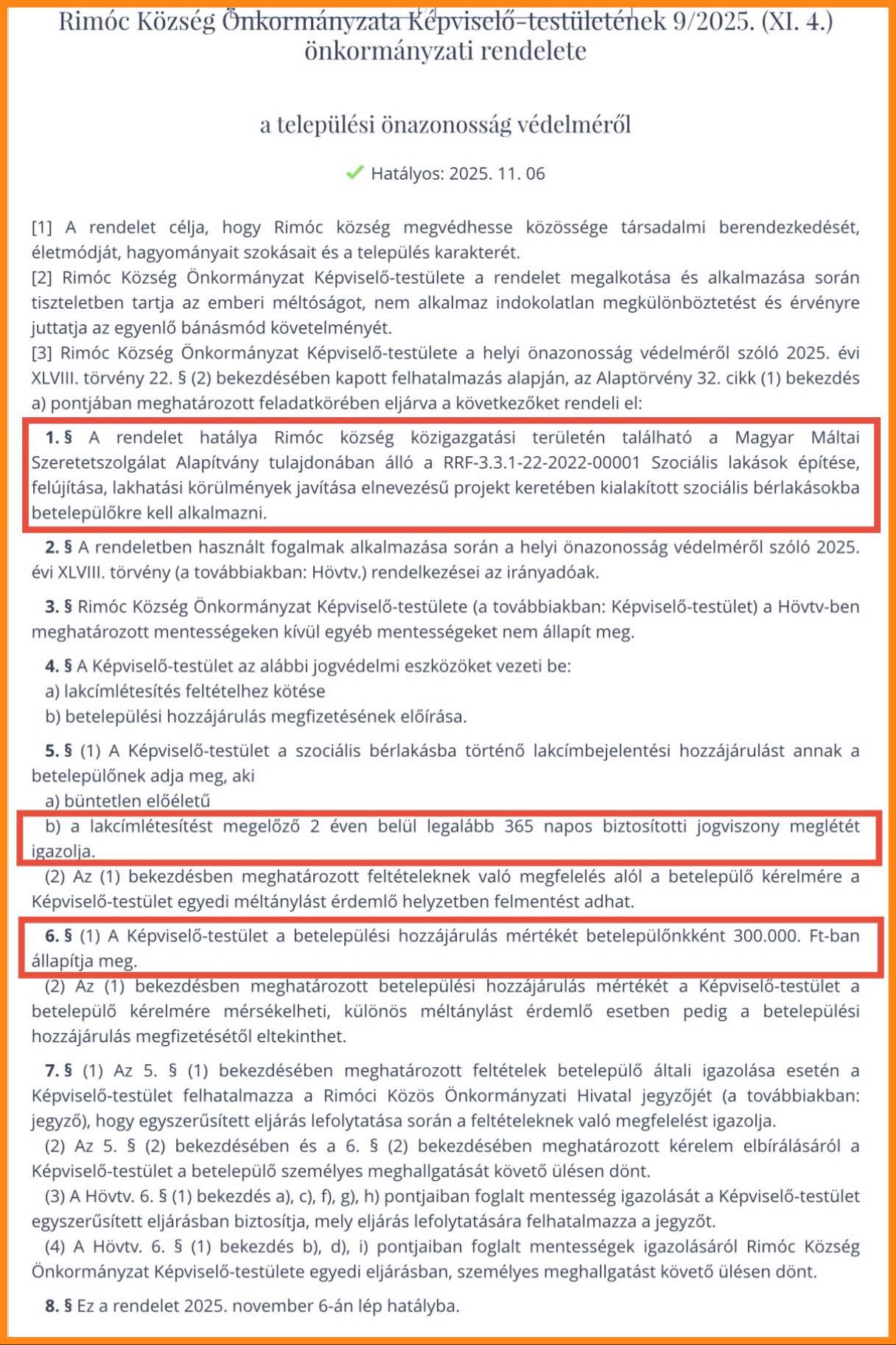 Csak a Máltai Szeretetszolgálat uniós támogatásból épült szociális bérlakásaiba beköltözőkre vonatkozik Rimóc önkormányzatának „önazonossági rendelete”, amely pénzbefizetést, hosszú biztosítási jogviszonyt és büntetlen előéletet ír elő – miközben más beköltözőkre nem alkalmazzák ezeket a feltételeket – közölte Hadházy Ákos független országgyűlési képviselő.