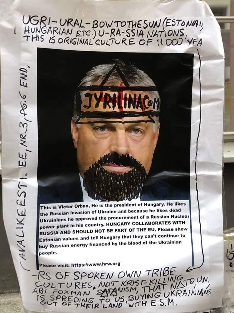 "Ez Orbán Viktor, Magyarország elnöke. Szereti Ukrajna orosz invázióját, mivel szereti a halott ukránokat. Engedélyezte egy orosz nukleáris erőmű telepítését az országában. MAGYARORSZÁG KOLLABORÁL OROSZORSZÁGGAL, ÉS NEM SZABADNA AZ EU TAGJÁNAK LENNIE. Kérjük mutasd meg észt becsületedet, és mondd meg Magyarországnak, hogy nem vásárolhat tovább orosz energiát, amit az ukrán nép véréből finanszíroznak" – áll a nyomtatott szövegben, tévesen elnöknek nevezve Orbánt.
