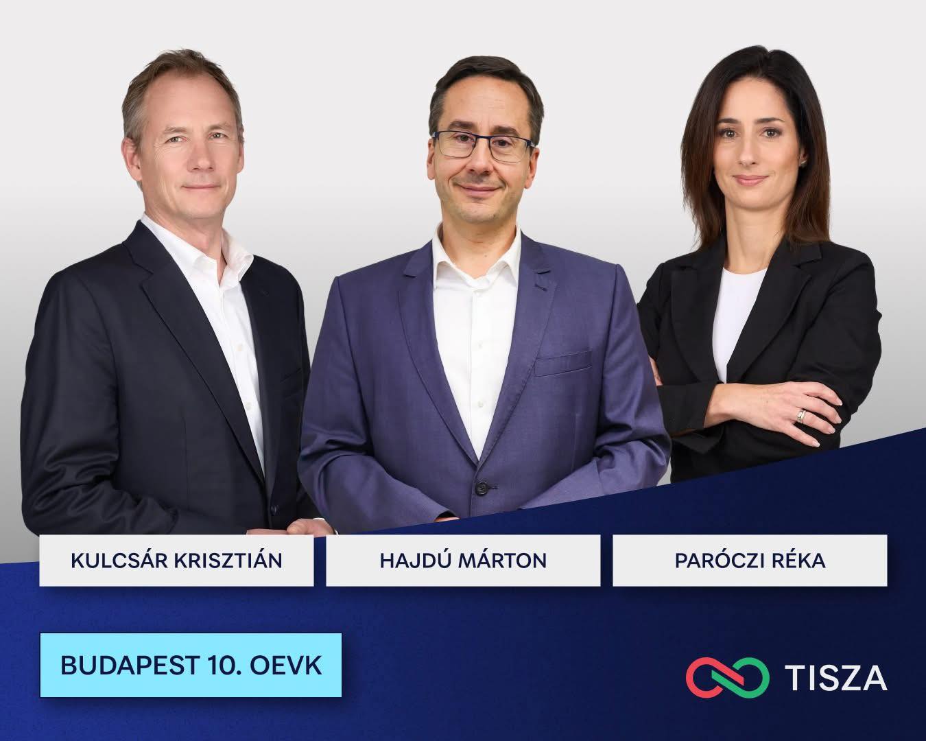 Budapest 10. választókerületében Kulcsár Krisztián, világ- és Európa-bajnok, olimpiai ezüstérmes magyar párbajtőrvívó, a Magyar Olimpiai Bizottság volt elnöke indul Hajdú Márton diplomatával, a Tisza EP-delegációjának kabinetvezetőjével és Paróczi Réka közgazdász, tanárral a jelöltségért.