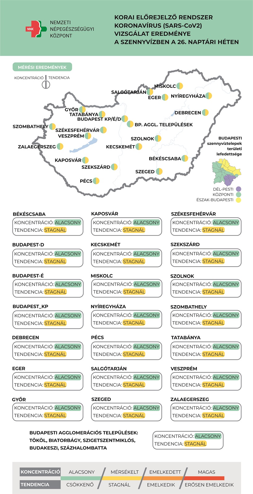 A 26. héten a szennyvízminták SARS-CoV-2 eredményeinek országos átlaga továbbra is alacsony szinten stagnált. Emelkedés egyik vizsgált városban sem volt megfigyelhető - tájékoztatott honlapján a Nemzeti Népegészségügyi Központ