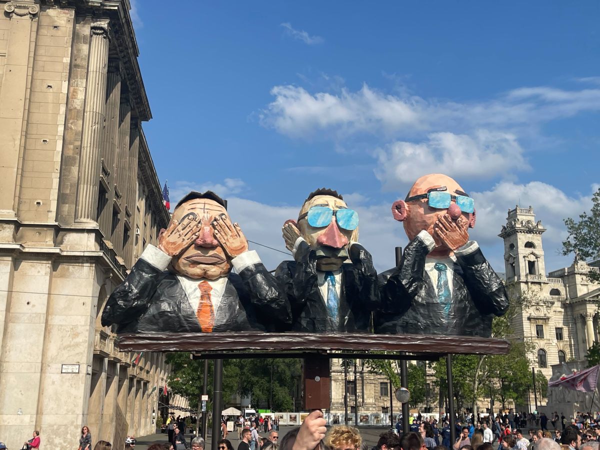 A tüntetők "elhozták" Orbán Viktort, Pintér Sándort és Maruzsa Zoltánt is.