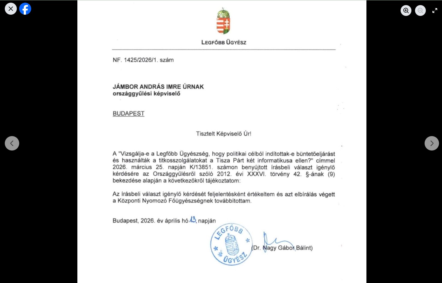 "Indul a nyomozás a Szabó Bence által feltárt ügyben! Válaszolt a legfőbb ügyész az írásbeli kérdésemre, feljelentésként értékelte, és elrendelte az ügy kivizsgálását a Tisza Párt elleni titkosszolgálati manőverek kapcsán" - írta közösségi oldalán Jámbor András.
