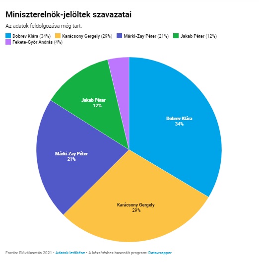 A miniszterelnök-jelöltről szóló szavazás első fordulóját minden jel szerint Dobrev Klára, a DK jelöltje nyerte. A második fordulóban Karácsony Gergellyel (MSZP, P, LMP) és Márki-Zay Péterrel kell megküzdenie. A győztes lesz a 2022-es parlamenti választáson Orbán Viktor kihívója – írja a 444.hu.