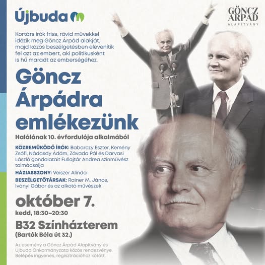 Október 7-én Újbuda Önkormányzata szintén a Göncz Árpád Alapítvánnyal közösen a B32 Színházteremben (Budapest, Bartók Béla út 32.) 18.30-tól tart megemlékezést, amelyen kortárs írók friss, rövid művekkel idézik meg Göncz Árpád alakját, majd közös beszélgetésben elevenítik fel azt az embert, aki politikusként is hű maradt az emberségéhez. Ezen részt vesz Babarczy Eszter, Kemény Zsófi, Nádasdy Ádám Závada Pál; Darvasi László gondolatait Fullajtár Andrea tolmácsolja. A rendezvény háziasszonya Veiszer Alinda lesz, beszélgetőtársai pedig Rainer M. János, Iványi Gábor és az alkotó írók. A belépés ingyenes, de regisztrációhoz kötött. (A Népszava nyomán)
