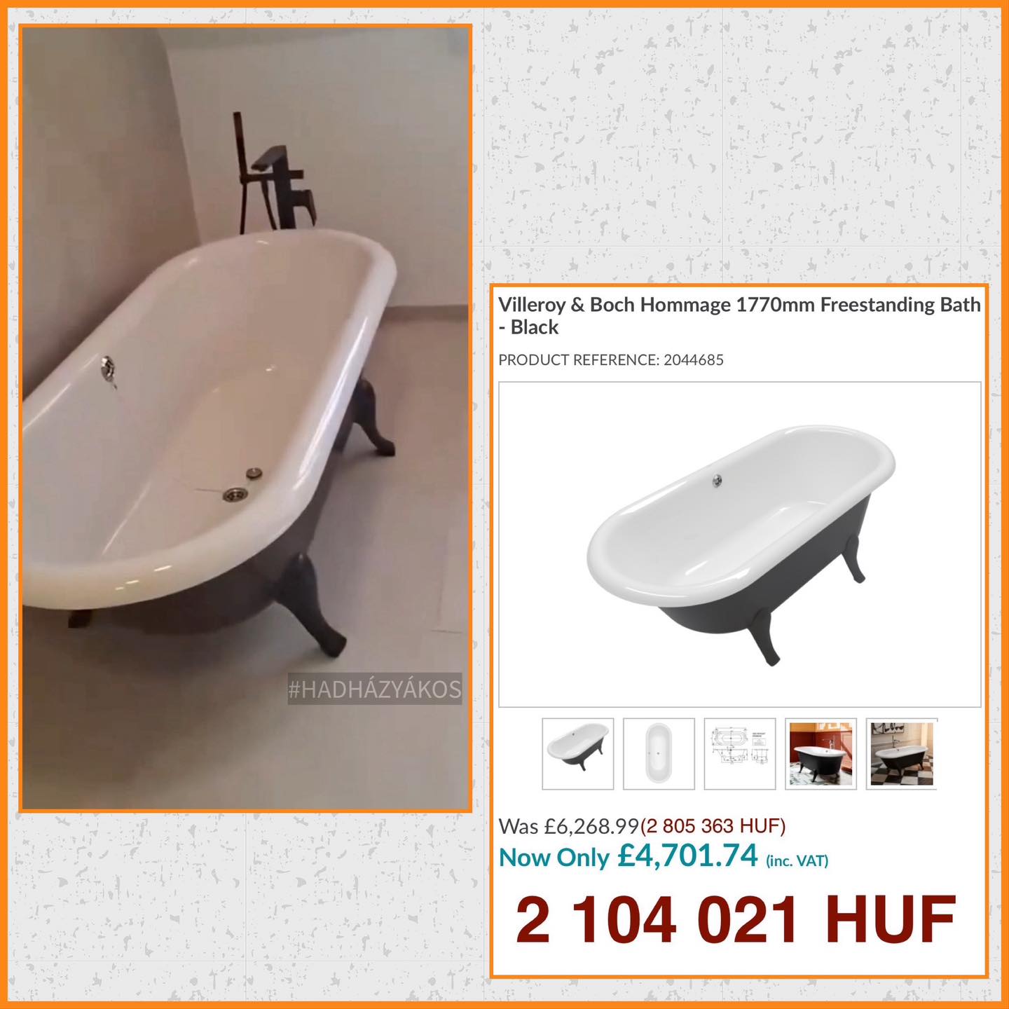 Hadházy mellékelte a kádak bolti leírását is, a Roca Newcast kádról azt írják, ez "egy klasszikus megjelenésű, szabadonálló öntöttvas kád, amely egyedi retró hangulatot visz a modern fürdőszobába". A Villeroy & Boch Hommage szabadonálló kád pedig "elegáns, letisztult vonalvezetésű designjával a klasszikus fürdőszobák kiemelkedő darabja, prémium öntött márvány anyagból, fekete színben készül és kifinomult megjelenést biztosít".