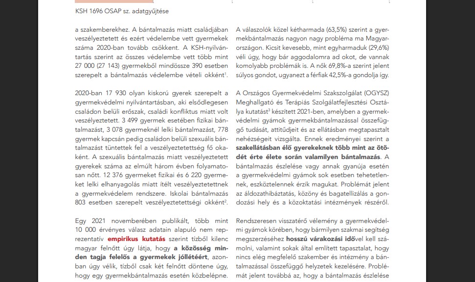A Hintalovon tanulmányban a 24 oldalon azt írták: "A Országos Gyermekvédelmi Szakszolgálat (OGYSZ) Meghallgató és Terápiás Szolgálatfejlesztési Osztálya kutatást (3) készített 2021-ben, amelyben a gyermekvédelmi gyámok gyermekbántalmazással összefüggő tudását, attitűdjeit és az ellátásban megtapasztalt nehézségeit vizsgálta. Ennek eredményei szerint a szakellátásban élő gyerekeknek több mint az ötödét érte élete során valamilyen bántalmazás.”