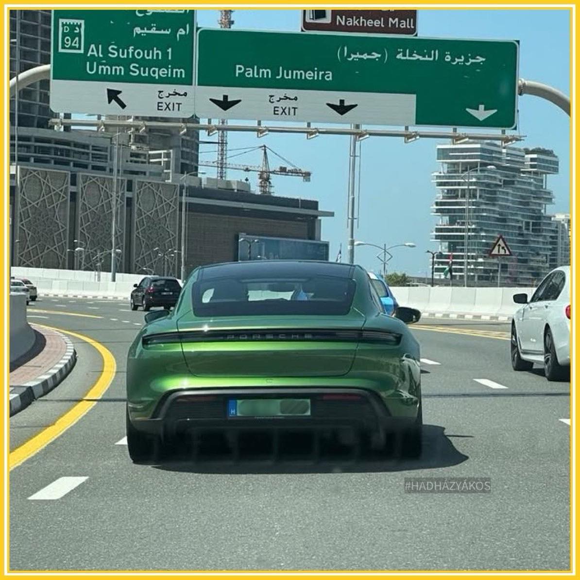 „Lehet fokozni a luxit: Dubajban fotózták le ezt a magyar rendszámú, rikító zöld Porsche Taycant (ára 60–80 millió)” – írja és mutatja a Facebookon Hadházy Ákos: