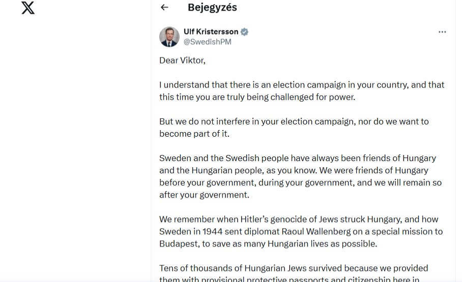 „Kedves Viktor! Tudom, hogy választási kampány folyik az Ön országában, és hogy ezúttal valóban komoly kihívással kell szembenéznie a hatalomért. De mi nem avatkozunk be a választási kampányába, és nem is akarunk részesei lenni annak” – kezdte posztját Kristersson az X-en.