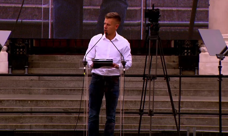 Magyar a beszéde alatt többször visszatért azokra a gondolatokra, hogy mennyire sokféle ember lehet most a Kossuth téren, színes közösséget szeretnének építeni és, hogy meg kell végre törni a turáni átkot, a mesterségesen egymás ellen fordított táboroknak össze kell fognia.