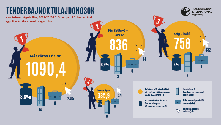 A vizsgálat szerint a szervezet 2023 óta működő közbeszerzési adatbázisának korábbi dobogósai sem panaszkodhatnak, hiszen a vizsgált közbeszerzések értékének csaknem negyedét vitte el összesen a legtöbb közbeszerzést elnyerő négy tulajdonos: a volt felcsúti polgármester és gázszerelő mellett