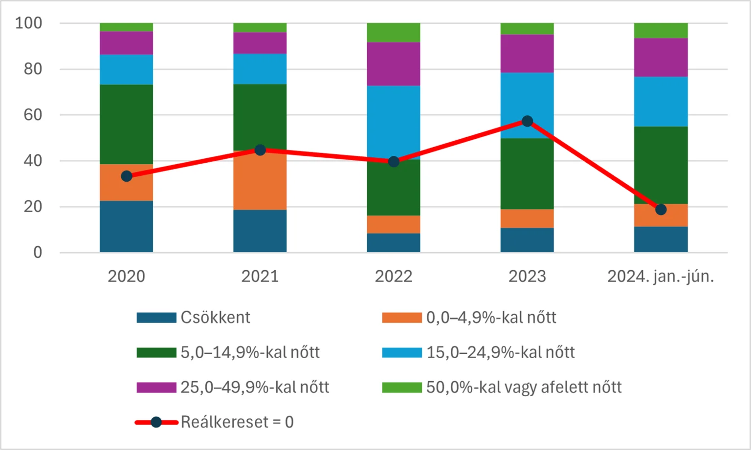 2021-ben 45%, 2022-ben 40% volt ez az érték, majd 2023-ban 57%, vagyis akkor több mint minden második foglalkoztatottnak csökkent a reálkeresete.