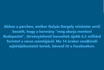 „Abban a percben, amikor Gulyás Gergely miniszter arról beszélt, hogy a kormány meg akarja menteni Budapestet, törvénytelenül leemeltek újabb 6,2 milliárd forintot a város számlájáról” – írta Karácsony Gergely, aki egyúttal jelezte: csütörtökön délután sajtótájékoztatót tart.