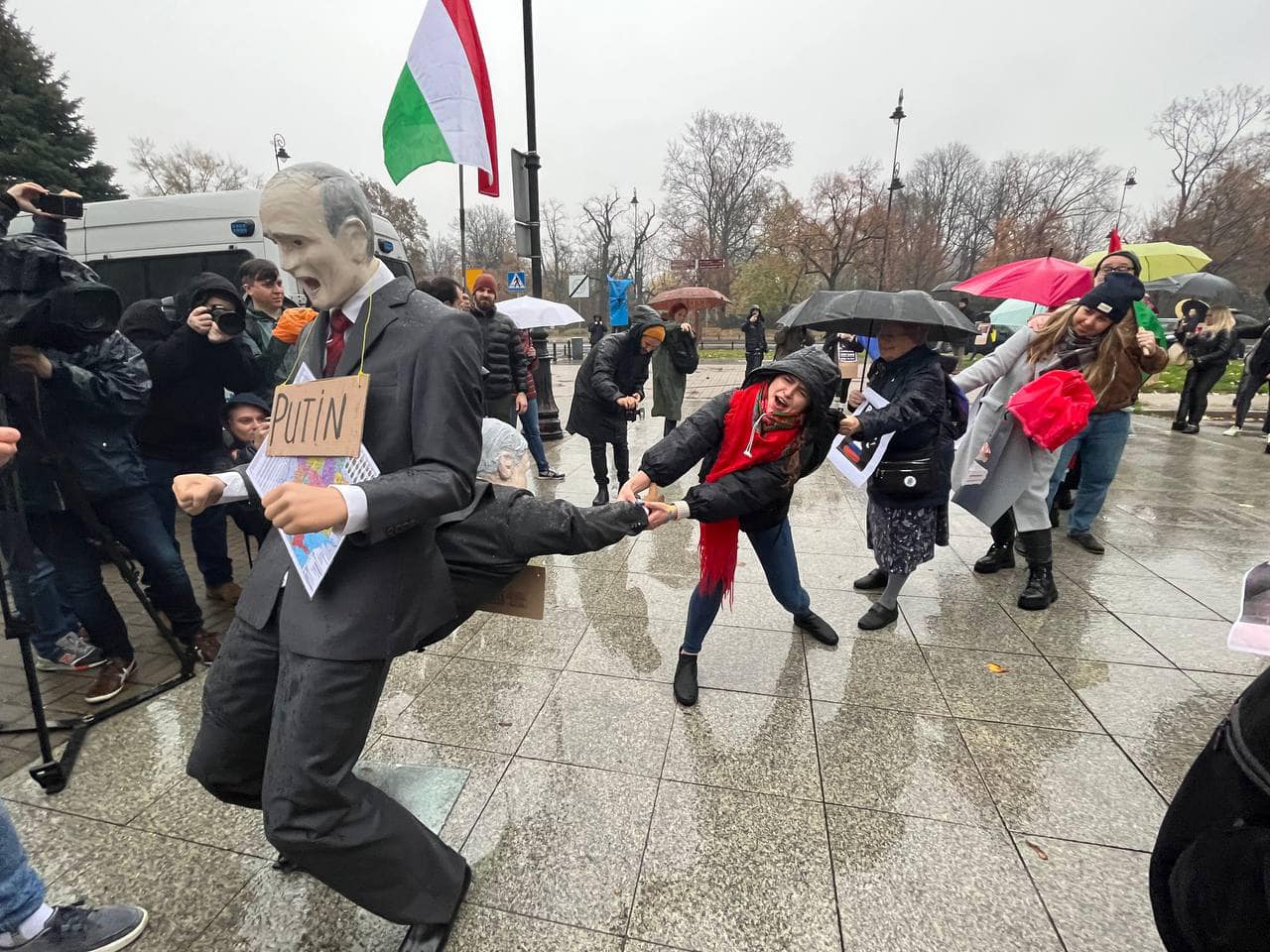 "Ma az egész Európai Unió támogatja Ukrajnát, és egyedül Orbán nyíltan támogat egy terroristát. Ezzel mi, lengyelek, európaiak nem értünk egyet! Korábban azért jöttünk ide a nagykövetséghez, hogy a magyar kormányhoz forduljunk, de most már nem akarunk velük tárgyalni. Ma a magyar néphez fordulunk és azt mondjuk: Támogassátok Ukrajnát együtt velünk! Keljetek fel Orbán ellen!"– ezt Dominik Dąsiorowski lengyel aktivista és Leroy Merlin, az összlengyel bojkott vezetője mondták a helyszínen a közlemény szerint. A performansszal azt akarták jelezni, hogy elítélik Orbán oroszbarát politikáját, és amiért emberi értékek árán üzletel Oroszországgal.
