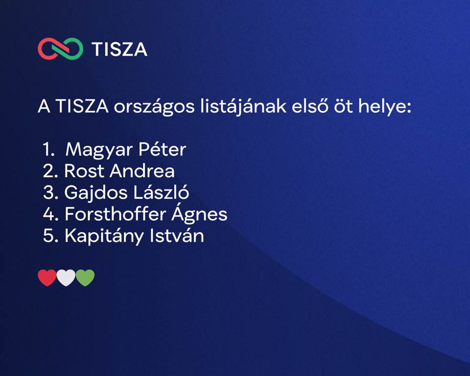 Magyar Péter, Rost Andrea, Gajdos László, Forsthoffer Ágnes és Kapitány István vezeti a Tisza Párt országos listáját az áprilisi országgyűlési választáson - jelentette be Magyar Péter. Ez az öt név fog szerepelni a szavazólapon.