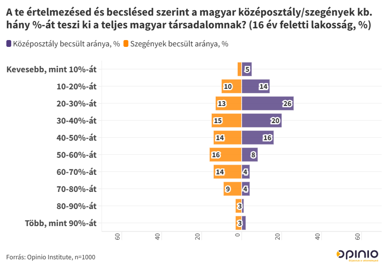 Az emberek sokkal nagyobbnak látják a szegénységet a valóságnál és relatív szűkebbnek látják a középosztályt – egyebek mellett ez derült ki az Opinio felméréséből. Minden a pénz körül forog, akik szegénynek tartják magukat, azok azért éreznek így, mert alacsony a jövedelmük vagy a háztartásuk nélkülöz alapvető szükségletű cikkeket - mondta Bojár Ábel kutatási igazgatója a Klubrádió Reggeli gyors című műsorában. Az is kiderült, hogy a relatív többség a kapcsolati tőkében látja az előretörés kulcsát, sőt, aki önmagát a felsőbb osztályba helyezi el, az a szüleit is oda sorolja.