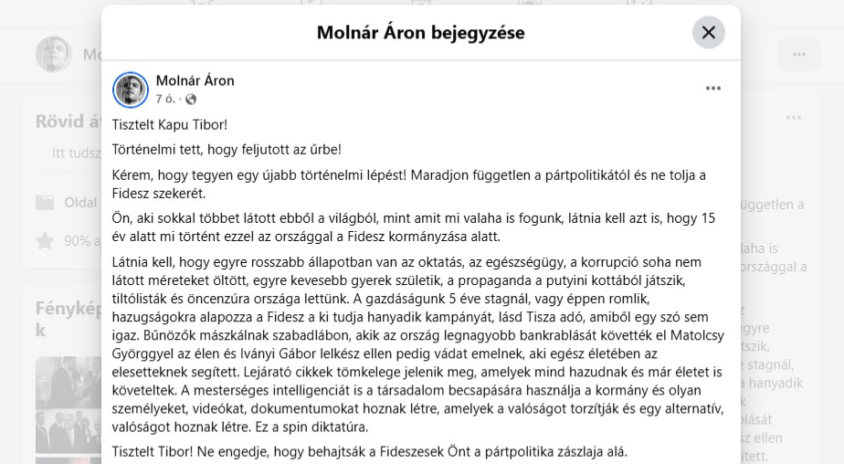 "Ön, aki sokkal többet látott ebből a világból, mint amit mi valaha is fogunk, látnia kell azt is, hogy 15 év alatt mi történt ezzel az országgal a Fidesz kormányzása alatt" – írta Molnár Áron, majd rámutatott az ország állapotára.