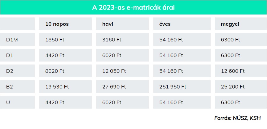 Az augusztusi infláció 15,6 százalék volt éves bázison, így a következő évben eszerint kell a matricaárakkal számolni. A személy gépkocsira váltandó heti (tíz napos) matrica így a jelenlegi 3 820 Ft-ról 4420 Ft-ra változik, a havi matrica 5210 Ft-ról 6020 Ft-ra, az éves 46850 Ft-ról 54160 Ft-ra, míg az éves megyei bérlet 5450 Ft-ról 6300 Ft-ra nő.