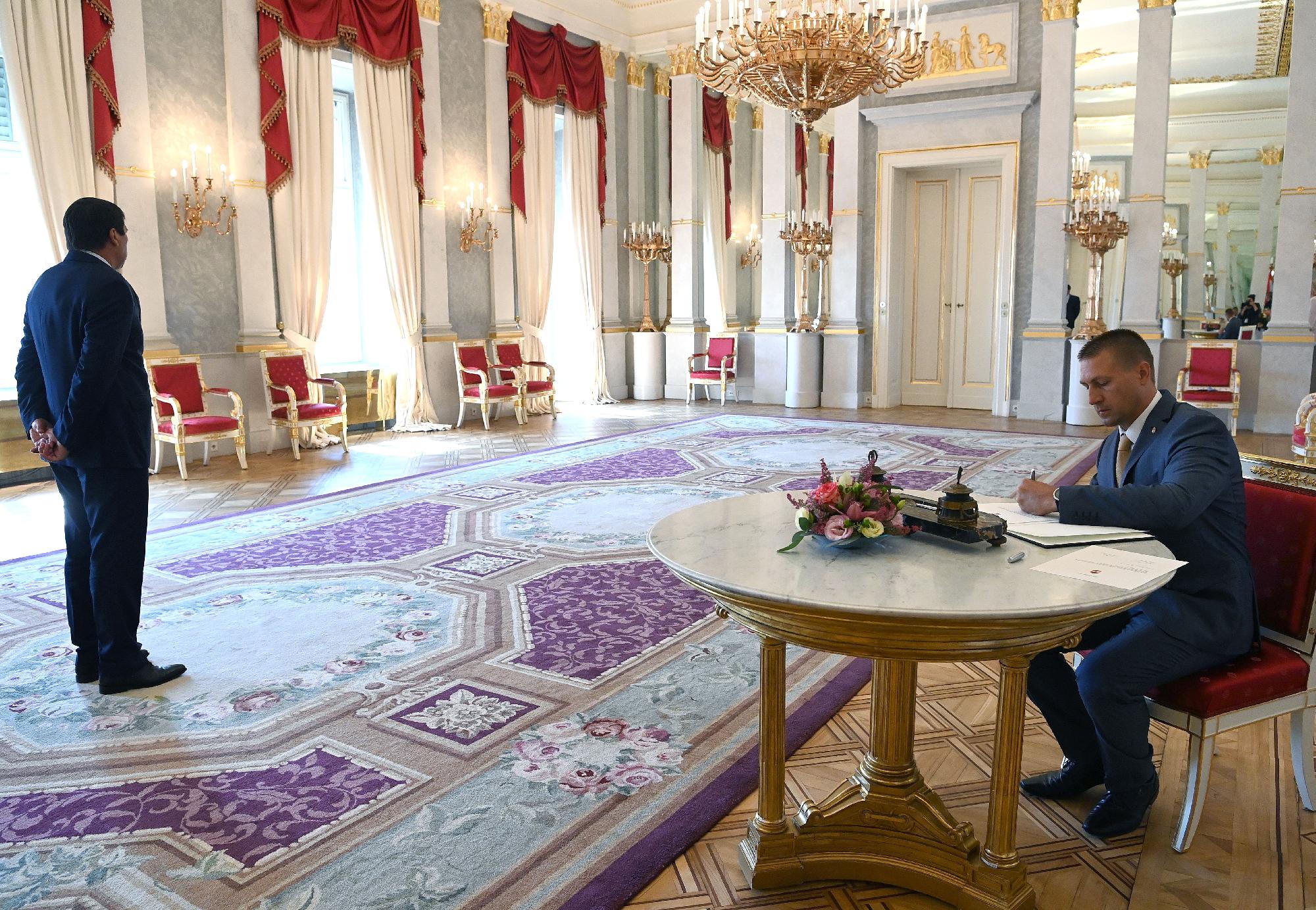 Budapest, 2020. szeptember 14. Nagy Attila Mihály, a Nemzeti Választási Iroda (NVI) új elnöke aláírja a kinevezési okmányt, miután átvette Áder János köztársasági elnöktől (b) a Sándor-palotában 2020. szeptember 14-én. MTI/Bruzák Noémi