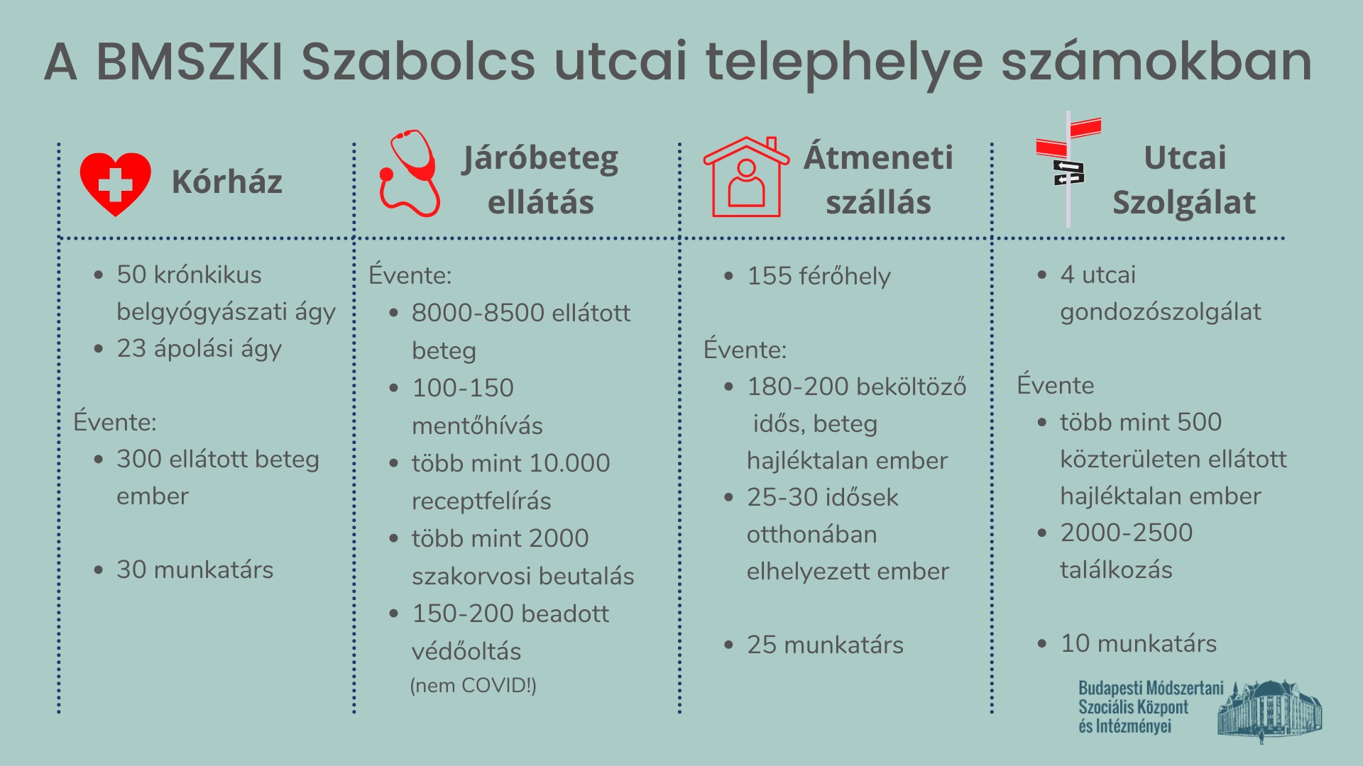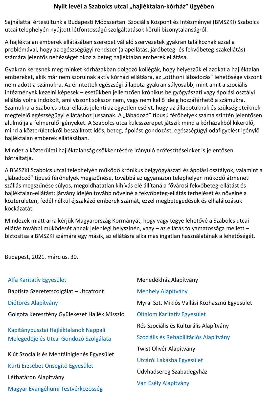 Nyílt levélben fordult a kormányhoz 19, hajléktalanok ellátására szakosodott szervezet a Szabolcs utcai hajléktalankórház megmentése érdekében. Mint írták, csak a sajtóból értesültek a kormány tervéről, amely felszámolná a BMSZKI telephelyén működő kórházat, hogy a kórháznak kialakított, jól felszerelt épületbe - a Magyar Nemzet értesülései szerint - az Országos Gyógyszerészeti és Élelmezés-egészségügyi Intézetet (OGYÉI) költöztesse. - írta meg a 444.hu.