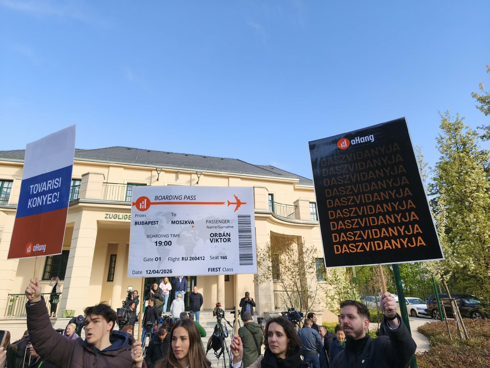 A miniszterelnököt a hazai és nemzetközi sajtó számos képviselőjéne kívül néhány ellentüntető is várta, orosz feliratokkal és egy Moszkvába szóló repjeggyel.