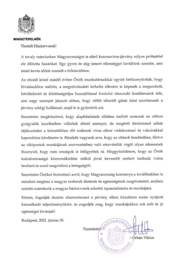 Orbán Viktor az ország minden háziorvosának köszönőlevelet küldött a vírus elleni védekezésben nyújtott munkájukért - írja a Bors.