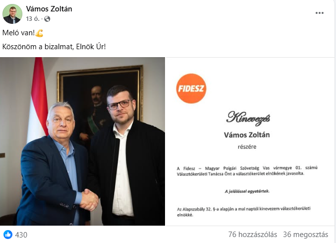 Már nem Hende Csaba a Fidesz Vas megyei egyes számú választókerületi elnöke – szúrta ki a Facebookon az ugytudjuk. A Vas megyei főispán, Vámos Zoltán ugyanis tudatta, hogy ő veszi át Hende posztját. Egy közös fotót is posztolt Orbán Viktorral, azt írta alá, hogy