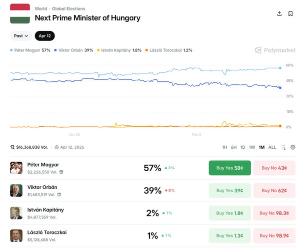„Nyílik az olló a Polymarketen: OV benézett 40 százalék alá” – kommentálta Török Gábor a Facebookon, hogy a Polymarket nemzetközi blokkláncalapú előrejelzési platformon Orbán Viktor választási győzelmi esélye beesett 39 százalékra – Magyar Péteré 57 százalékon áll.