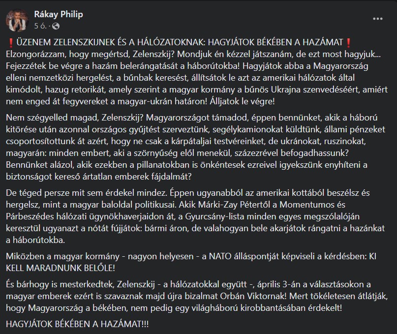 Rákay Philip felháborodott hangvételű posztban reagált Zelenszkij Magyarországgal szemben megfogalmazott kritikájára. A NER kegyeltje szerint Ukrajna "ugyanabból az amerikai kottából játszik", mint a magyar "baloldal". Azonban ennél is tovább ment, szerinte bárhogy is mesterkedik Zelenszkij, vagy a baloldal, április 3-án a magyarok újra megválasztják Orbán Viktort. Arra utalt, hogy az ukrán elnök beavatkozna a magyar választásokba.