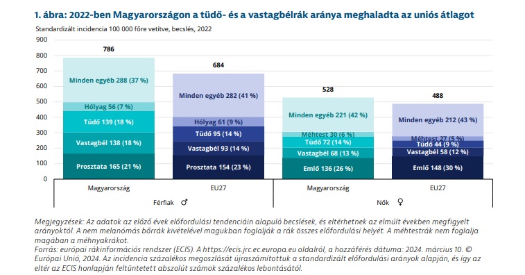 A jelentés szerint Magyarországon mind a férfiak, mind a nők esetében uniós átlag feletti a rákos megbetegedések száma és az ebből fakadó mortalitás. Ebben komoly szerepe van a tüdőráknak és vastagbélráknak. Annak ellenére, hogy 2011 óta csökkent a rák miatti halálozás, 2021-ben a 100 000 lakosra jutó 310 daganatos megbetegedésből fakadó halálozás jutott, ezzel továbbra is EU-szerte Magyarországon volt a legmagasabb ez az adat. A férfiak körében 100 000 lakosra 415, mint a nőknél 100 000 lakosra 245 halálozás jutott.