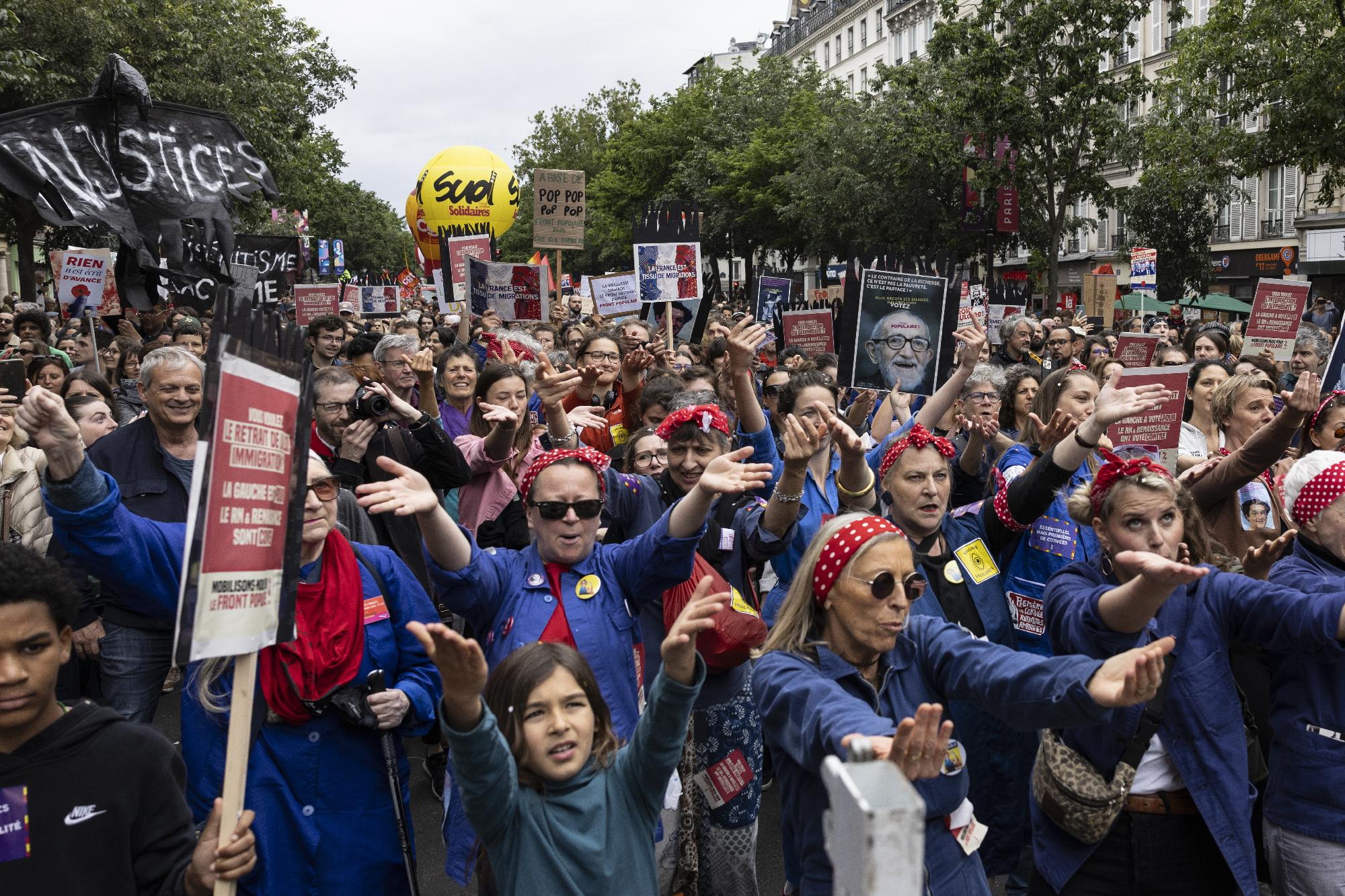 Párizs, 2024. június 15. A szakszervezetek, az újonnan létrehozott baloldali koalíció és civil szervezetek felhívására tüntetnek a jobboldali Nemzeti Tömörülés (RN) ellen Párizsban 2024. június 15-én. Franciaországban június 30-án és július 7-én előrehozott parlamenti választásokat tartanak.