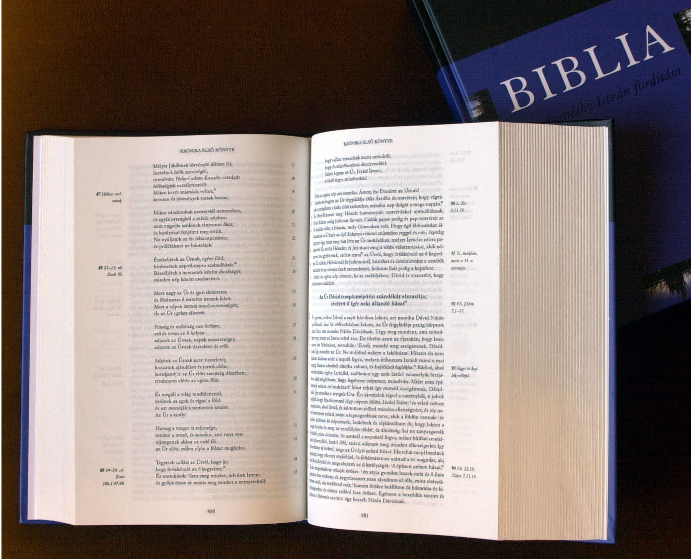 Debrecen, 2002. június 4. Debrecenben a kollégiumi esték keretében mutatták be a Kecskeméthy biblia első kiadását. Kecskeméthy István 1926 és 1935 között dolgozott a biblia fordításán, de akkor nem került kiadásra. Most a kolozsvári Koinonia Kiadó gondozásában megjelent bibliát a debreceni Református Kollégium dísztermében mutatták be, ahol tudományos előadások méltatták a fordító érdemeit. A képen: a biblia tipográfiája követi az eredeti kézirat szerkesztését, a lapszéleken a kiadó jegyzetei is megmaradtak. MTI Fotó: Oláh Tibor