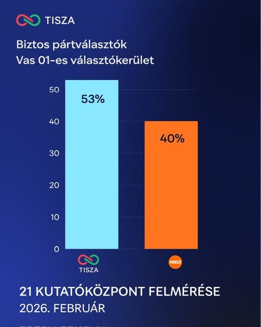 Magyar Péter a felmérés apropóján arra hívta fel a figyelmet: míg a Szombathely központú körzetben 2022-ben a Fidesz még 52-37 arányban győzött, most a Tisza vezet 53-40-re."