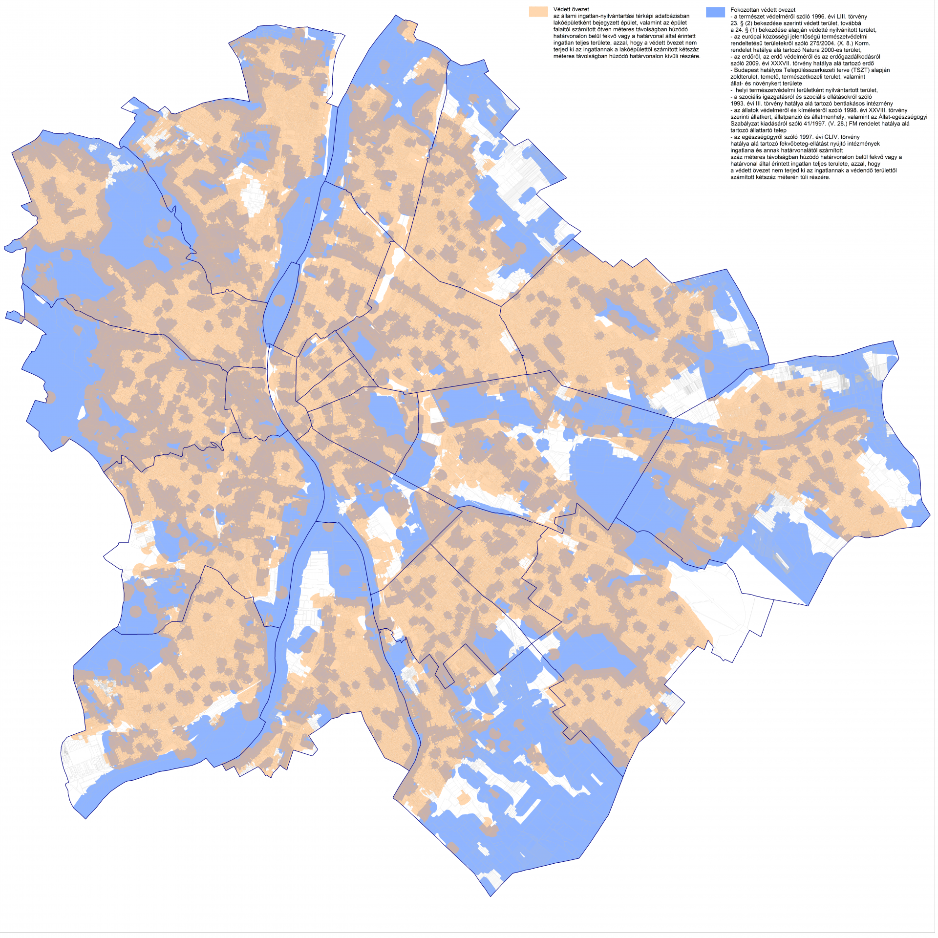 A budapesti közterületek besorolását a Főváros közleménye tartalmazza. A térkép sárga színnel a lakott területeket, kék pedig a fokozottan védett területeket jelöli, tehát
