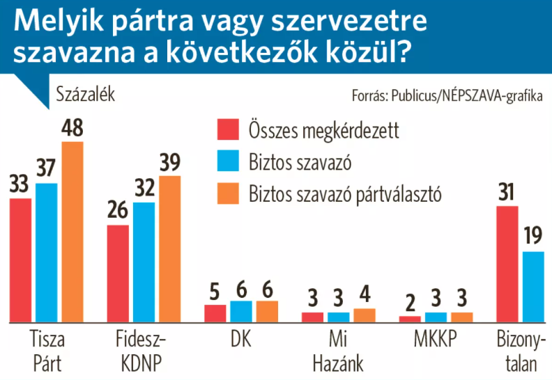 Az előző hónaphoz képest a Tisza Párt mindhárom csoportban erősödni tudott, míg a Fideszről ez nem mondható el, igaz, a változás hibahatáron belül mozog. A bizonytalanok aránya 31 százalék.