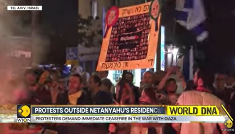 Többek "állítsátok meg a háborút”, illetve "crime miniszter” feliratú táblákkal vonultak Tel-Aviv főutcáján. A Demokrácia terén néhány tüntető vörösre festve feküdt a földön, tiltakozva az ország demokráciájának a hanyatlása ellen. Az izraeli belbiztonsági ügynökség, a Sin Bét volt vezetője beszédében Izrael legrosszabb miniszterelnökének nevezte Netanjahut. (Az MTI nyomán)