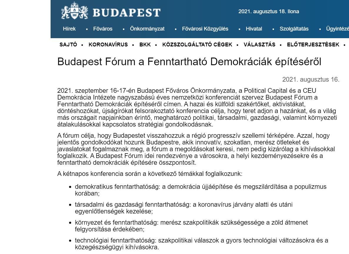 A szerző, aki csak „Munkatársunk” néven jelenik meg, részletezi, hogy kik „vettek részt” a kétnapos, angol nyelvű konferencián, amelyet a Fővárosi Önkormányzat, a „baloldalhoz ezer szállal kötődő Political Capital” és a CEU Demokrácia Intézete szervez.