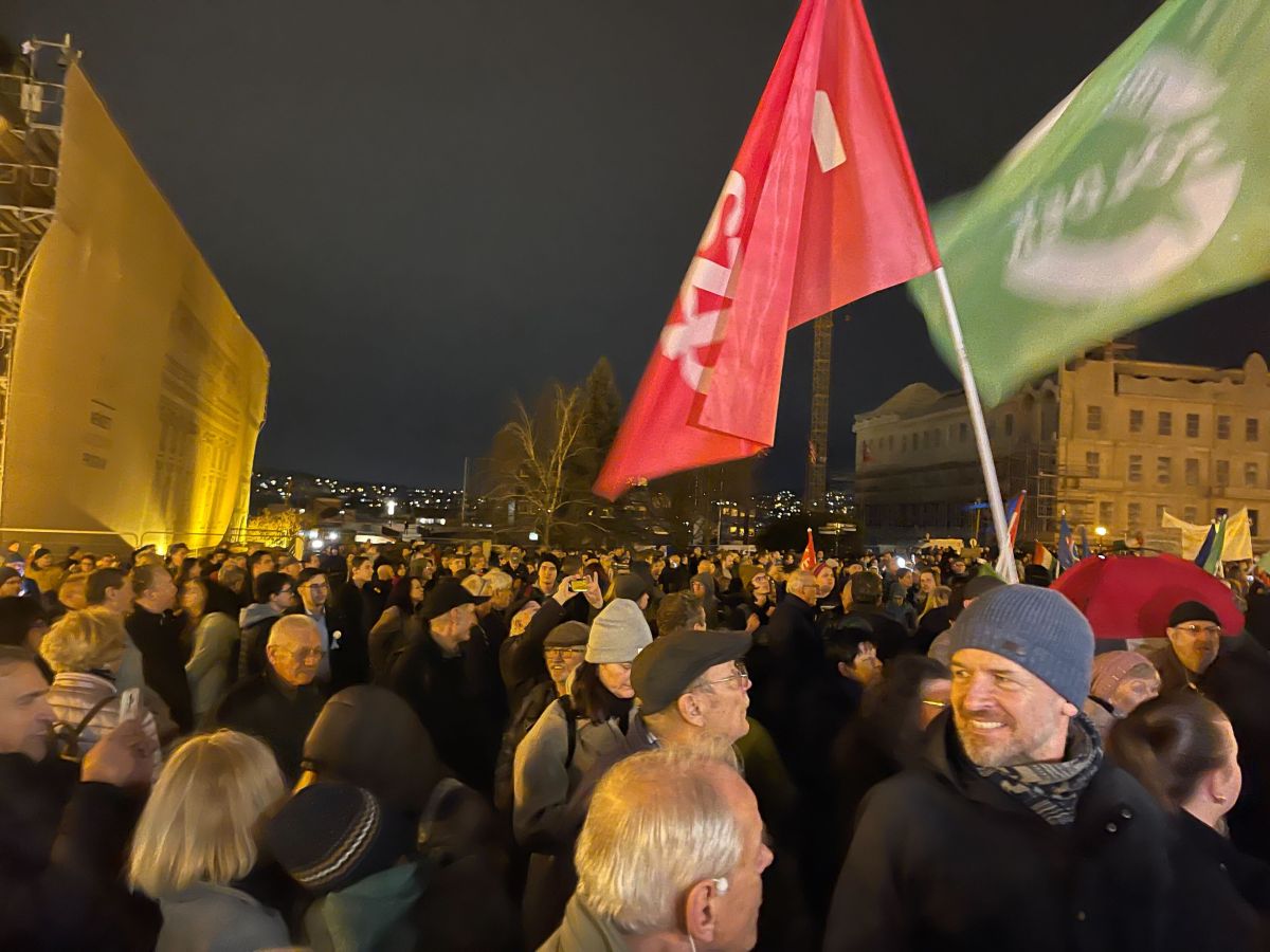 Este hat órára érkeztek meg a Novák Katalin kegyelmi ügye ellen tiltakozó tüntetés résztvevői a Sándor-palota elé, ahol beszédek kezdődtek. A tömeg közben azt skandálta, hogy "Írd alá Kata a lemondásodat!", "Mocskos Fidesz!" és "Tolvaj Fidesz!".