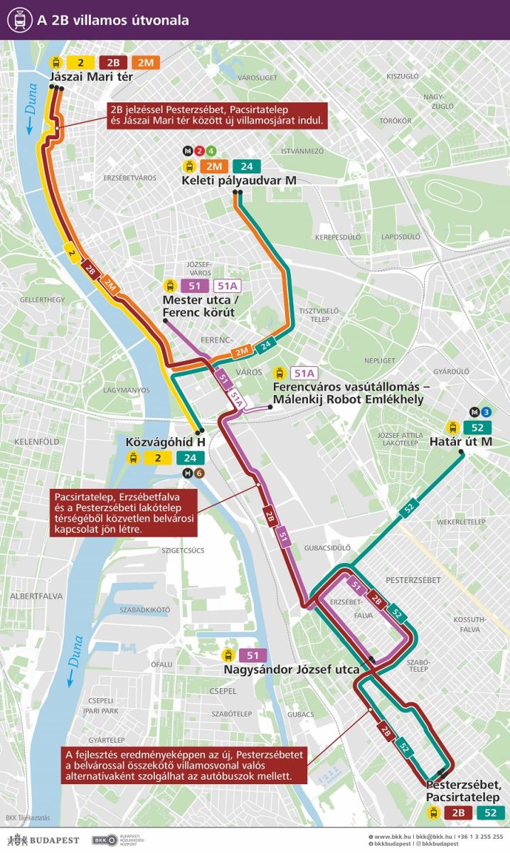 A közleményben arra is felhívták a figyelmet, hogy augusztus közepétől a pesti Duna-parton így már három járat közlekedik majd: a 2-es, a 2B és a 2M villamosok. A 2M várhatóan sűrűbben közlekedik majd. Az 51-es azonban csak csúcsidőben fog járni, azon kívül az 51A villamossal lehet utazni a Ferenc körút és Könyves Kálmán körút térsége között. A Mester utca Haller utca és Ferenc körúti szakaszán a villamosok változatlan kínálattal közlekednek: az 51-es és az 51A villamosok követési ideje nem változik a BKK szerint.