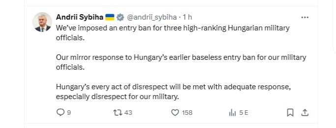A tárcavezető szavai szerint ez Ukrajna tükörintézkedése arra, hogy Magyarország korábban ukrán tiszteknek tiltotta meg a beutazást. A magyar döntést Szibiha megalapozatlannak nevezte. "Ukrajnának megvan a maga méltósága, és nem fog szemet hunyni Magyarország tiszteletlensége felett, különösen ha az a hadseregünket érinti" - tette hozzá a külügyminiszter.