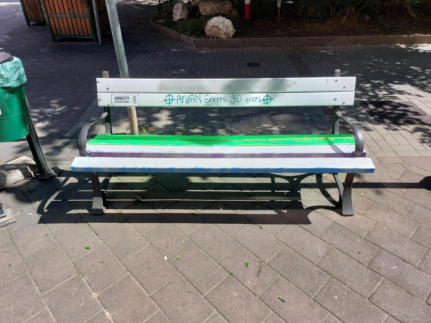 A múlt csütörtökön átadott pad eredetileg szivárványszínű lett volna a Pride-hoz kapcsolódóan, de az Aryan Greens (Árja Zöldek) nevű FTC-ultracsoport tagjai zöld-fehérre festették, majd amikor visszakapta eredeti színeit, akkor se hagyták annyiban, még egy "Stop LMBTQ" feliratot is fújt elé két csuklyás alak.